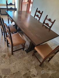 Sala da pranzo in stile neogotico in noce anni 70, composta da credenza con quattro cassetti e quattro ante, larghezza mt. 2,50, profondità mt. 0,56, altezza mt. 1,33. Tavolo mt. 1,90 x mt. 0,90, altezza mt. 0,80 e sei sedie con seduta in cuoio. Pezzi vendibili anche separatamente