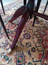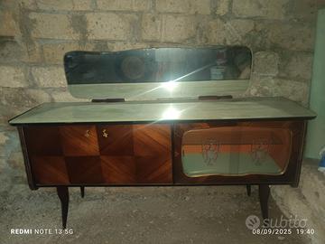 Sala da Pranzo vintage anni '50 composta da tavolo con vetro decorato finitura lucida bordeaux e puntali in ottone, 6 sedie, due mobili bassi con specchio (uno con 4 sportelli e cassetti interni, uno con sportelli e vetrina bar). Non restaurati, imbottitura superiore delle sedie in ottime condizioni. Possibilità di acquisto anche separatamente o mobili o tavolo con sedie