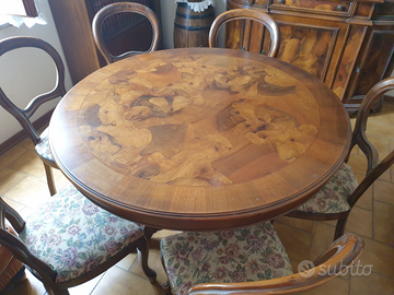 Sala in noce, tavolo allungabile e vetrina in radica di noce, 6 sedie imbottite, tavolo da fumo, tutto in ottimo stato, solo alcuni graffi sul tavolo. Richiesta 1200 euro.