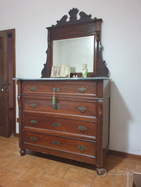 Como' (canterano) e due comodini, legno pieno lastronato, con top in marmo grigio (bardiglio), presumibilmente primi del '900, in perfette condizioni. Richiesta 800 euro.