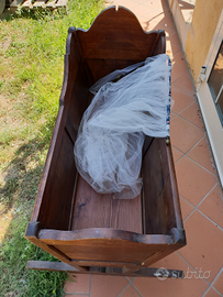 Culla in legno pieno, arte povera toscana, con struttura per zanzariera, una gamba da sistemare, ma per il resto in ottime condizioni. Richiesta 400 euro.
