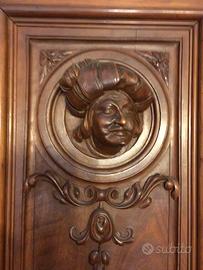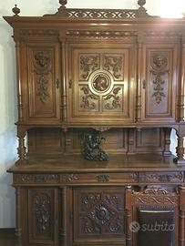 Sala composta da due mobili, un tagolo, 6 sedie e un lampadario in ferro battuto. Il tutto in noce, risalente al 1800. In ottime condizioni. Antiquariato di pregio