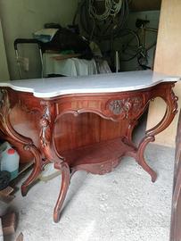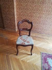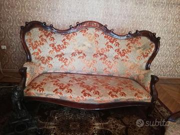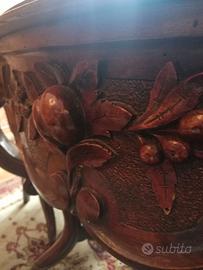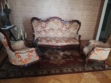 Causa ristrutturazione alloggio entro fine agosto 2025, vendesi, possibilmente in blocco, sala Luigi Filippo in noce, fine '800 composta da: tavolo ovale con belle decorazioni di frutta, sei sedie foderate in tessuto damascato velluto rosa antico, consolle con piano in marmo, divano e due poltrone.