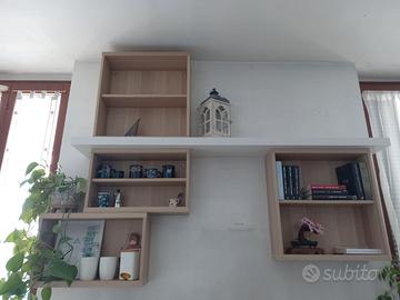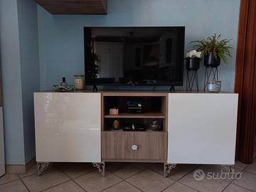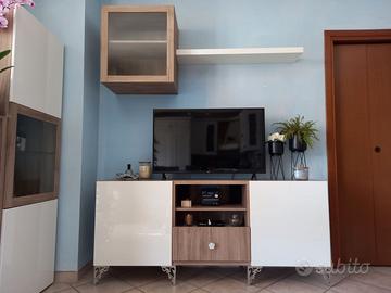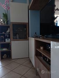 Mobile tv con vetrinetta e mensole, finitura noce,anta bianca lucida. Lunghezza 2 m