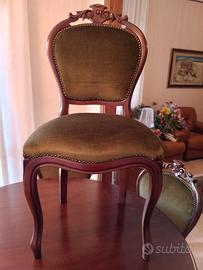 •Set di 6 Sedie: Coordinate al tavolo, con schienale intagliato e seduta imbottita in pregiato velluto verde oliva, rifinite con borchie originali.