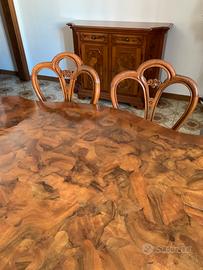 Salotto/sala pranzo in radica di noce, composto da un tavolo , sei sedie con seduta in velutto; mobile a parete con vetrinetta e mensole da esposizione; credenza bellissima .Tutti i pezzi sono in buono stato. Ritiro in loco, smontaggio e trasporto a carico dell'acquirente. (Zevio, Verona)