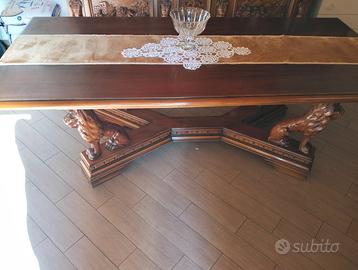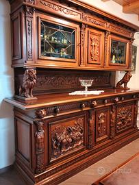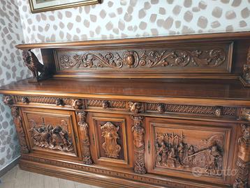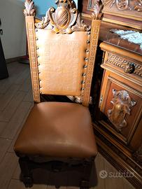 Prestigiosa sala da pranzo in autentico stile rinascimentale italiano, realizzata interamente in legno massello e caratterizzata da una raffinata lavorazione artigianale. Il set comprende il tavolo , sei sedie intagliate e due credenze con armadietti e cassetti, arricchite da intagli rinascimentali. L’insieme rappresenta un arredo di grande valore storico ed estetico, ideale per ambienti che richiedono eleganza, rappresentanza e qualità senza compromessi.