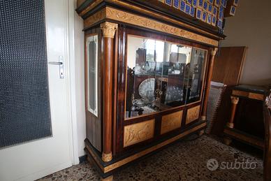 Vendo sala stile impero (praticamente mai usata era dei miei genitori che non la usavano per non rovinarla ) fabbricata negli anni 60 con 2 como' con specchiere lunghi 3 metri e 3,2 metri, Cristalliera Tavolo grande 120 per 220 cm piani di marmo verde alpi intarsi di acero e noce massiccio e impiallacciature radica,e dorature comprensivo di sedie in noce - spedizione e trasporto a carico dell'acquirente - l mobili si trovano al primo piano