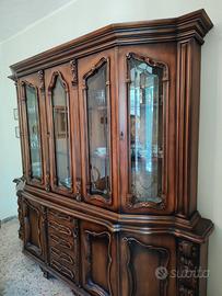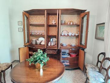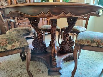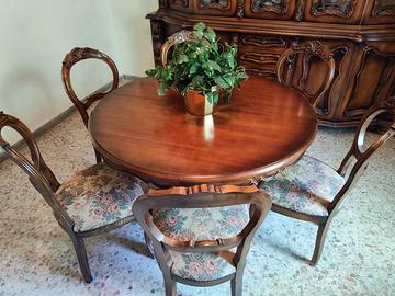 Vendo salotto in stile classico in perfette condizioni, quasi mai usato. La sala si compone di: mobile, tavolo, 6 sedie, tenda, lampadario di cristallo. Dimensioni: Mobile 267x55x238h cm Tavolo grande allungabile: diametro 121 x 77h Sedie: 98x50x50 circa Tenda: 2.35 cm larghezza x 2.95h Si regala anche un tavolinetto dello stesso stile, ma con qualche segno di usura 62 cm diam x 48 cm h. Il materiale è ritirabile/ visionabile a Marta. Ritiro a carico dell'acquirente.