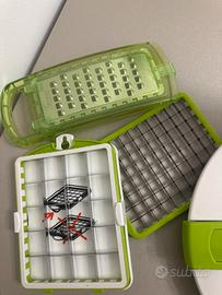 Vendo Salad Chef Genius (set 9 pezzi) per preparare insalate, verdure e frutta in modo pratico: permette di lavare, scolare, tagliare e grattugiare con un unico kit, comodo anche per servire o conservare.