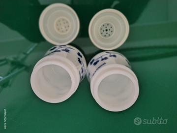 Set vintage di saliera e pepiera in Arcopal. Presentano un grazioso motivo floreale blu su sfondo bianco.