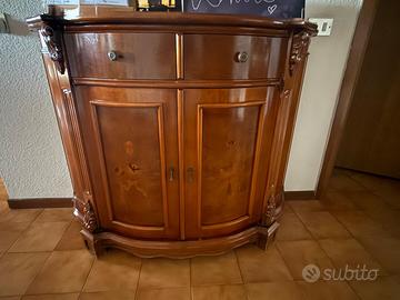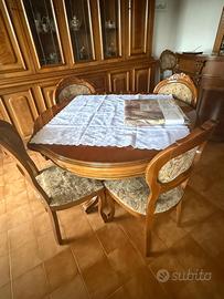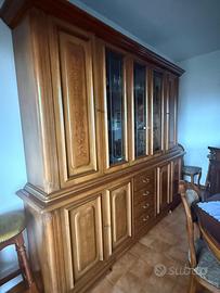 Vendo soggiorno in legno massello compreso di: - Tavolo tondo con 6 sedie (H 80cm x L 120cm) - Cristalliera a 5 ante + 2 scomparti spaziosi e 4 cassetti (H 225cm x L 263cm x P 50cm) - Mobile ingresso a 2 ante + 2 cassetti (H 90cm x L 115cm x P 44cm) - Angolo bar composto da due pezzi + 2 sgabelli Parte alta (H 210cm x L 112cm x P 27,5cm) Bancone (H 104cm x L 136cm x P 42cm)