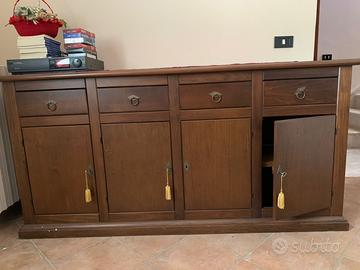 Soggiorno in legno massello composto da cristalliera madia e mobiletto multiuso. La madia presenta solo una piccola macchiolina sul cassetto