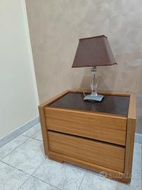 Camera da letto: comodini, mobile con specchio e lampade da notte.