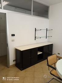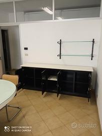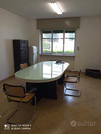 salone per ufficio riunionioni con tavolo grande e pianale ricoperto in vetro ,,mobile con 5 vani , 2 mensole in vetro moderno , 1 panchina , 1 angolo per fioriera ,1 mobiletto con 2 porte ,