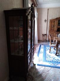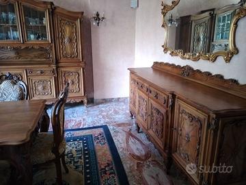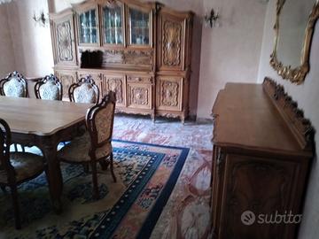 Salone Rinascimento Veneziano in prezioso legno di Mogano composto da: Credenza alta con cristalliera (lunghezza 280, altezza 240), Credenza bassa con specchiera dorata (lunghezza 230), Tavolo da 8 posti (lunghezza 215) con 8 sedie in velluto beige damascato coordinate, Vetrinetta verticale (altezza 200, larghezza 100), Parapetto divisorio a 11 colonne intarsiate artigianalmente L. 315cm, Tappeto Orientale 368x280 Blu/Beige. Conservato con estrema cura. Vendo a €. 5.990.