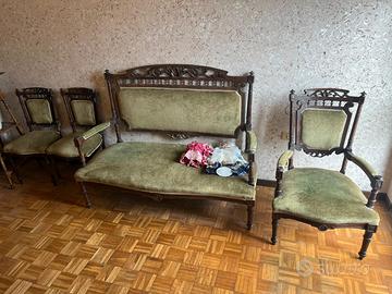 Salottino in legno massello e velluto verde composto da divano, poltrona, puffo, tavolino e due sedie.