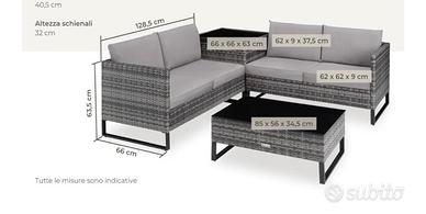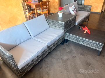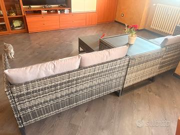 Salottino in rattan,meno di un anno di vita,pagato 380 euro. Tutto completo come in foto e componibile come meglio di preferisce se lineare o angolare… cuscini lavabili e impermeabili. Nelle ultime foto ci sono tutte le misure.