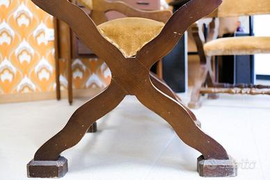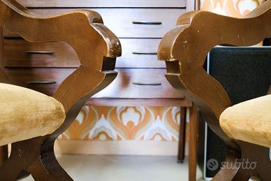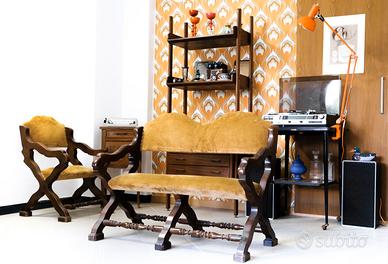 Salottino in stile italiano composto da una panca a due posti ed una sedia, realizzati in legno di rovere massello con seduta e schienale imbottiti in velluto. Entrambi i pezzi sono caratterizzati da gambe mosse raccordate da traverse tornite e braccioli a giorno. Presenta segni del suo viaggio nel tempo.