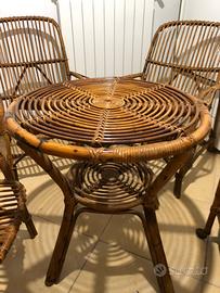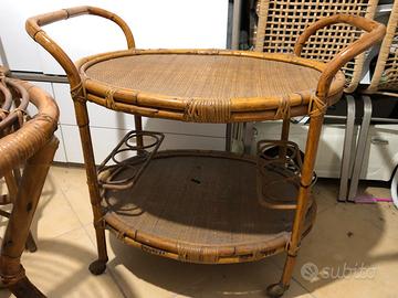 Bellissimo salottino, in bamboo e vimini, VINTAGE anni ‘50. Il tutto è composto da 3 sedie grandi e comode, un tavolino con doppio ripiano e un carrello bar ovale con portabottiglie al ripiano sottostante con 4 ruote.