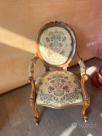 Pregiato salottino ottocentesco (tra metà e fine XIX secolo) in stile Luigi Filippo, con influenza tardo-Biedermeier, costituito da divanetto due posti, poltroncina con braccioli e poltroncina semplice, Legno curvo e intarsiato, tessuto a disegno floreale simmetrico che richiama i damaschi e broccati ottocenteschi.