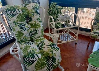Salottino vimini composto da 2 dondoli un divanetto in vimini e un divanoletto. I PEZZI IN VIMINI SONO USATI MENTRE I CUSCINI SONO NUOVI MAI USATI. Il divano letto ha il coprititto poiche il tessuto e' macchiato ma la strutgura e' integra.....nel complesso e' un bellissimo salone da giardino. I tavolino non sono in vendita. RiTIro a carico dell acquirente ma trattasj di piano ammezzato.