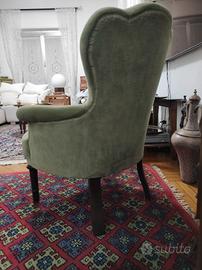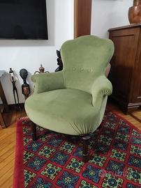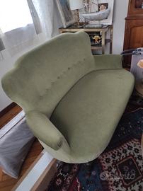 Salottino vintage restaurato in velluto verde salvia e legno,composto da divanetto e due poltrone. misure divano Larghezza 145 altezza 90 profondità 85 misure 2 poltrone larghezza 70 altezza 88 profondità 75