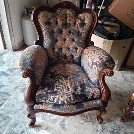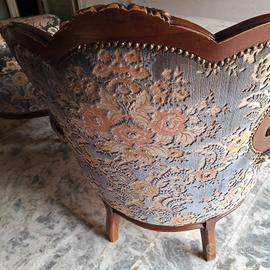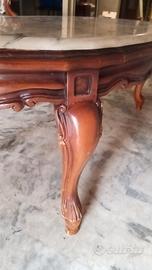 Salottino in noce di legno massello con poltrone imbottite e tavolo con marmo integro.