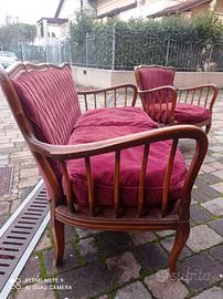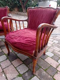 Questo è un salottino vintage composto da divano e poltrone, il cui design è attribuibile a Paolo Buffa e risalente agli anni '40/'50.Le condizioni sono buone ovviamente sono pezzi vissuti. Tessuto di velluto bordeaux in buono stato il legno è stato lavorato a mano e i pezzi ovviamente non sono perciò identici non è una produzione industriale ma artigianale. Vendo in provincia di Rimini e l' acquirente interessato deve occuparsi del trasporto.