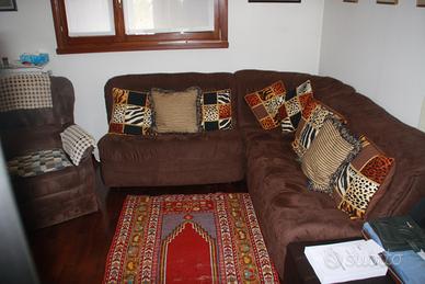 Salotto ad angolo in tessuto costituito da tre pezzi con 8 cuscini. 5 posti comodi