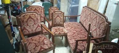 Salotto primi anni trenta del XX secolo in stile liberty, in legno e velluto, completo di divano e due poltrone più specchio