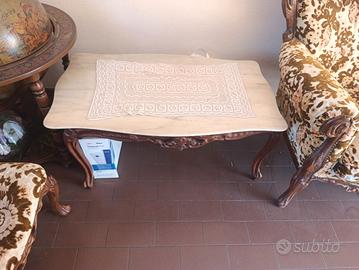 vendo un salotto antico composto da un divano, due poltrone, due sedie e un tavolino con ripiano di marmo. il prezzo è trattabile.