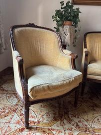 Il legno presenta una finitura calda e ben conservata, con intagli a mano tipici dello stile neoclassico francese (gambe scanalate, schienale sagomato, braccioli arrotondati).