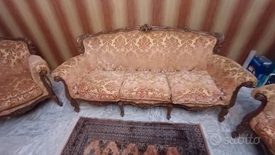 Splendido salotto artigianale in stile lombardo, risalente agli anni ’70, composto da divano a 3 posti e due poltrone abbinate.