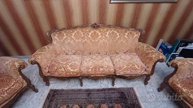Splendido salotto artigianale in stile lombardo, risalente agli anni ’70, composto da divano a 3 posti e due poltrone abbinate. La struttura è interamente in legno massello, impreziosita da raffinati intagli realizzati e rifiniti a mano, che testimoniano l’elevata qualità artigianale del pezzo. Il tessuto originale in velluto fiorellato è in condizioni eccellenti, così come le imbottiture di alta qualità, confortevoli e ben conservate nel tempo. ✔ Nessun difetto strutturale ✔ Nessun difetto estetico ✔ Materiali pregiati e lavorazione artigianale autentica Ideale per ambienti classici o di pregio, ma perfetto anche per contesti retrò o di modernariato, dove può diventare un elemento di grande carattere e personalità. Un salotto di grande fascino, pronto per essere utilizzato senza necessità di interventi.