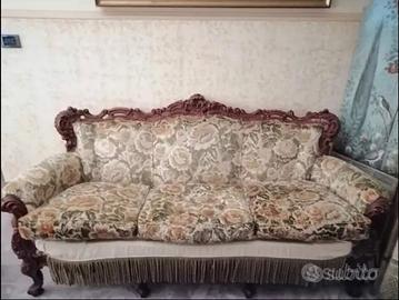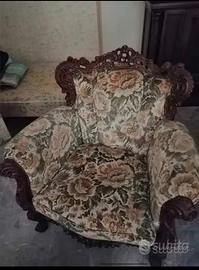 Vendesi salotto (divano e due poltrone) stile barocco con intarsi nel legno e nel tessuto di rivestimento, perfettamente conservato. Cuscini della seduta completamente sfoderabili. Possibilità di acquisto del solo divano a 100 euro e singole poltrone a 50 euro l'una; intero salotto venduto a 150 euro.