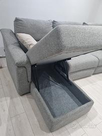 Salotto Carola con 2 relax elettrici con telecomando e con una chaise longue con contenitore. I braccioli sono smontabili con incastro a baionetta. La chaise longue è possibile montarla a dx ed a sx della composizione. Il salotto è rivestito con tessuto grigio ed è tutto sfoderabile. La spalliera è alta.