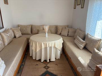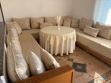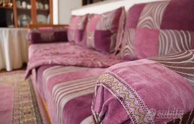 Cellulare: +39 388 696 9184 IN VENDITA SALOTTO CLASSICO ARABO IN TINTA ROSA Prodotti: -Cuscini principali in tinta Rosa e Beige/Oro (Grandi) misure 73x43cm condizione più che buona. -Cuscini poggia braccia cilindrici in tinta Rosa e Beige/Oro (Piccoli) 73x23cm diametro. condizione più che buona. -Tappeto classico arabo in tinta rosa e Beige/Marroncino 300x160cm condizione nuova. -2 Sofà con rivestimento Rosa e Beige/Oro 270x75x30cm condizione più che buona. -1 Sofà con rivestimento Rosa e Beige/Oro 250x75x30cm condizione più che buona. -Cuscini sopra-sofà triangolari in tinta Rosa condiziona quasi nuova. -Supporti rialzati di legno in misura rispettiva dei sofà realizzati con dettagli ricavati nel legno. INCLUSE NELLA VENDITA MA NON PRESENTI IN FOTO: -Tende in tinta Rosa chiaro 300x270cm -Tende in tinta Beige/Iro chiaro 300x270cm