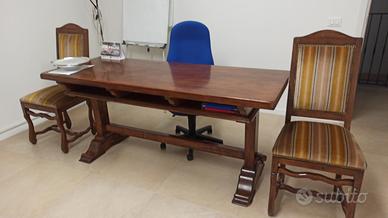 Nella foto è presente un elegante salotto composto da un divanetto a due posti e due poltrone abbinate, tutti con struttura in legno lavorato e rivestimento in tessuto vellutato color senape. Il set è completato da un tavolino in legno con gambe sagomate, dal design classico. Il tutto è posato sopra un tappeto orientale a motivi rossi, che aggiunge calore e carattere all’ambiente.
