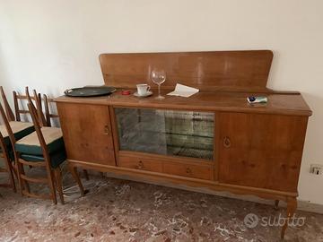 Arredamento da salotto anni 50 completo di due credenze , tavolo con piano in vetro e 6 sedie. Legni che necessitano di manutenzione