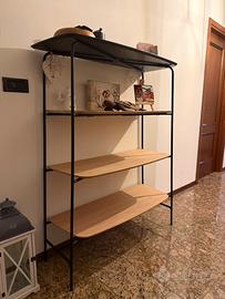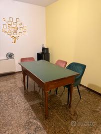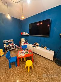 Salotto completo di divano angolare imbottito, mobile a parete basso, tavolo e poltroncine, libreria