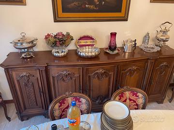 Vendo salotto della Giorgetti, completo, composto da 2 divani in legno di noce intagliato, un tavolo in legno di noce da 6/8 posti con le relative sedie, una poltrona, un tavolo basso, una credenza, una vetrina.