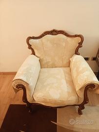 Struttura in legno massello finemente intagliato a mano con cimasa superiore lavorata, gambe cabriolet e braccioli sagomati – tipico delle produzioni artigianali italiane degli anni '80/'90 (stile Cantù/Meda o simili).