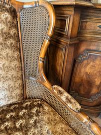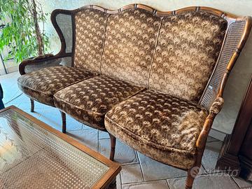 Salotto vintage in bambù, tessuto e vimini, Italia 1980. Divano 3 posti + due poltrone + tavolino. Periodo di progettazione dal 1980 al 1989. Produzione anno 1980. Paese di produzione Italia. Condizioni pari al nuovo. Praticamente mai utilizzato.
