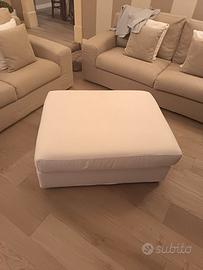 Vendo numero due divani in tessuto colore sabbia, compreso di cuscini come da foto allegate, compreso di puff di colore bianco sempre in tessuto.