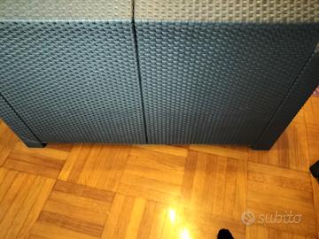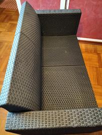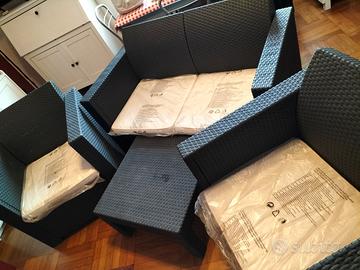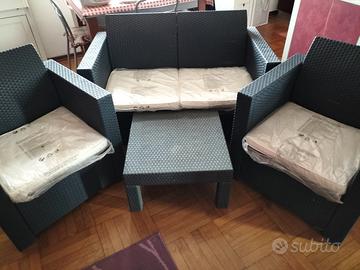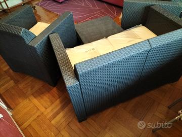 Salotto da esterno in plastica effetto vimini, composto da divanetto 2 posti, due poltrone e tavolino. Compresi cuscini. Misura divano 126 x 67, poltrone 73 x 67 , tavolino 59 x 59. Bene tenuto. Ritiro a mano.