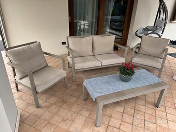 vendo salotto da giardino, compreso di 4 sedute totali con cuscini e un tavolino, ha due anni di vita sempre stato al coperto sotto al portico