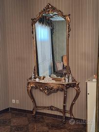 - Consolle con specchiera in stile barocco veneziano in legno intagliato e dorato con piano in marmo.