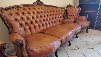 Vendo salotto vintage con struttura in legno e rivestimento in vera pelle in condizioni ottime. Il tutto composto da divano a tre posti e due poltrone come da fotografie.