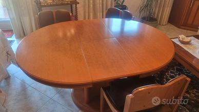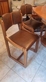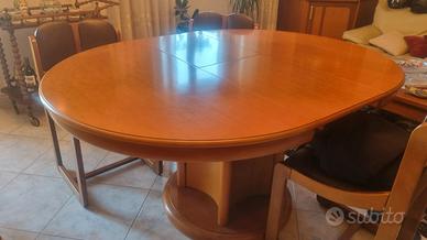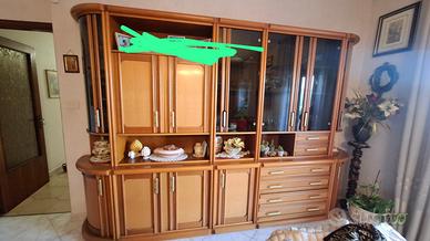 Vendesi salotto composto da : tavolo in legno allungabile con 6 sedie in legno e pelle + angoliera in legno + parete attrezzata in legno e vetro + carrellino alcolici in legno.